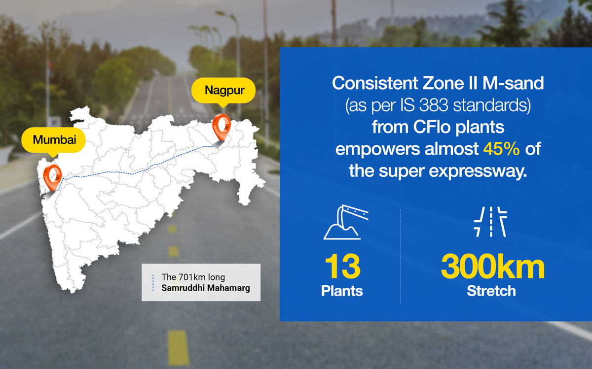 Availability of river sand being a major issue in Maharashtra, the construction of this expressway by MSRDC (Maharashtra State Road Development Corporation) demanded a continuous supply of IS 383 grade M-Sand. This is when we flung into action with the goal of providing comprehensive sand solutions and establishing a sustainable and scalable sand resource for the project. In need of an economical, ecologically sound and quality-controlled supply of M-sand, we were the first sand washing company that occurred to the contractor on commencement of the project.